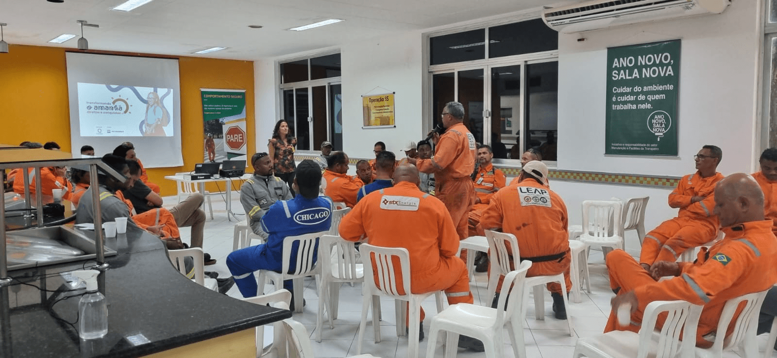 A oficina começou com uma acolhida com os trabalhadores, que em sua maioria são de empresas terceirizadas à Transpetro. Em seguida, houve uma atividade em grupos, para que os participantes analisassem mitos e verdades sobre a adultização. Foram distribuídas frases nas quais eles precisaram debater se a situação era de violência, o tipo e se eram adequadas à idade do jovem e o que um adulto poderia fazer para intervir.